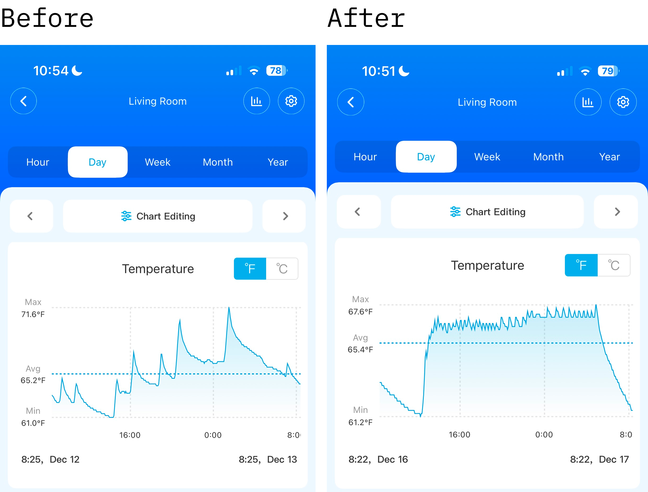 And the temperature in the house is way, way more flat. As you can see in the image below (taken from a Govee brand thermometer that sits nearby).