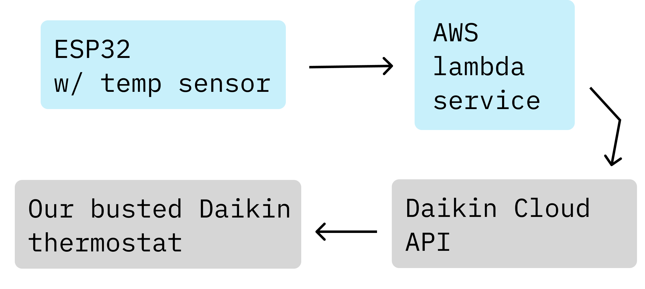 A few days ago I found out that our “smart” thermostat talks to Daikin “in the cloud”, and that there is a developer API that can be used to control the thermostat. So I built my own thermostat that measures the room temp and overrides the Daikin behavior by changing its set point to above or below whatever it thinks the room temperature is. So, now, the DIY thermostat goes set point up, set point down, set point up all day automatically for us.