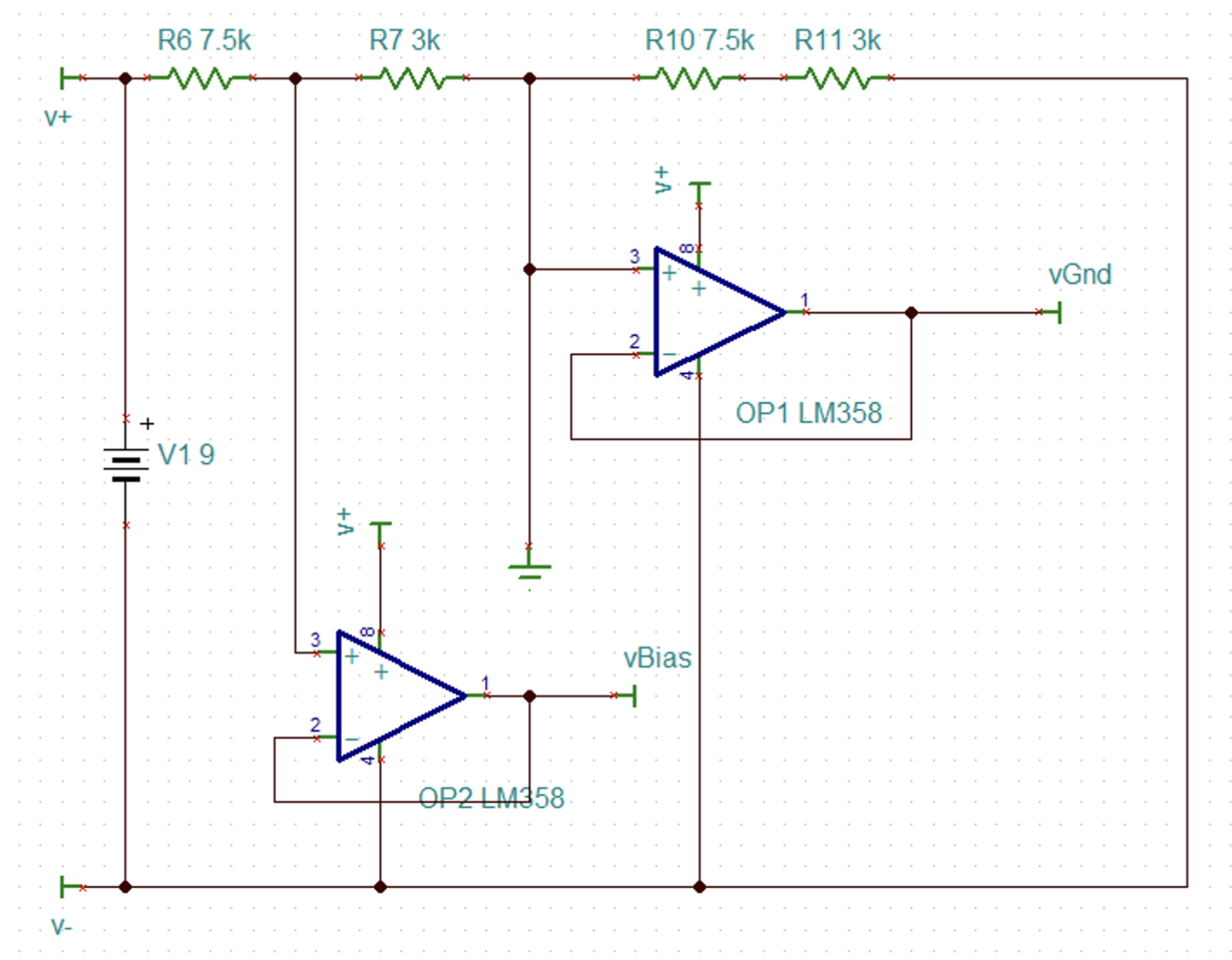 For now I’m using an LM358 op-amp to buffer the virtual ground. If you don’t buffer the virtual ground, then the voltage division could be effected by any load that is applied.