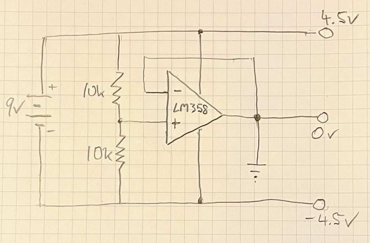 I decided to use a voltage divider approach to create a virtual ground from a 9 volt battery, effectively providing +/- 4.5 volts, which will be suitable to drive the analog part of the circuit.