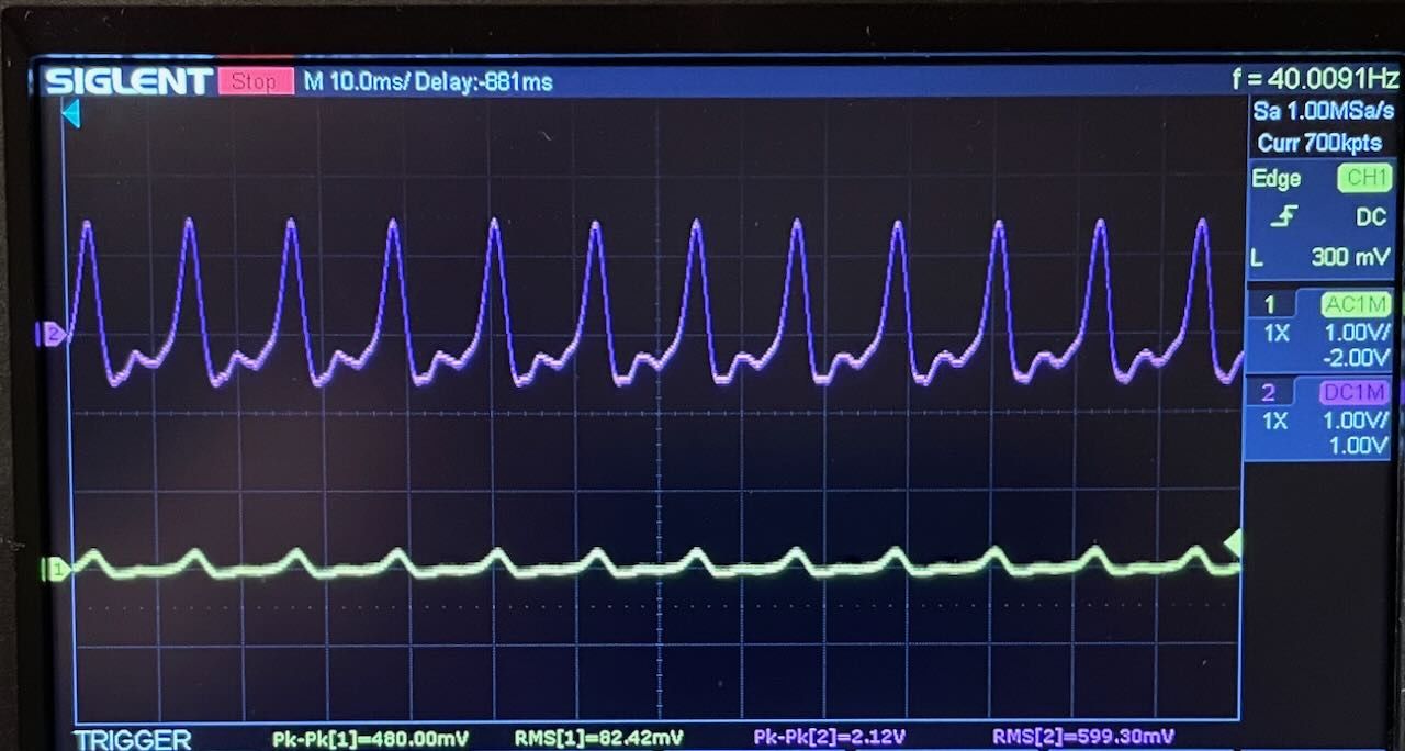 Below, the raw guitar signal (yellow) and amplified (purple):