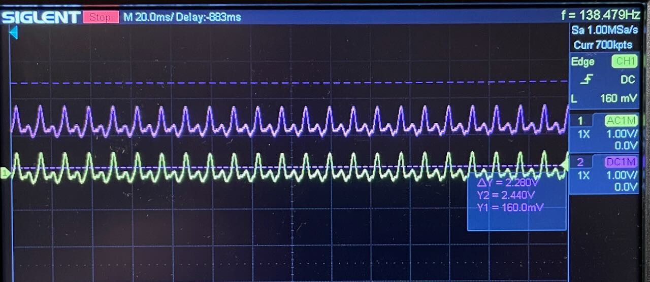 Below is the amplified audio signal (yellow) and the biased signal (purple) with 150mv and 2300mv marked in dashed lines. The signal is falling between about 900mv and 1840mv, well within the range of ADC.