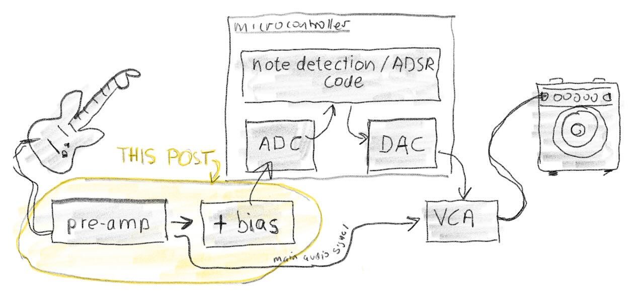 Pre-Amp and Biasing for ADC in an Analog Guitar Pedal